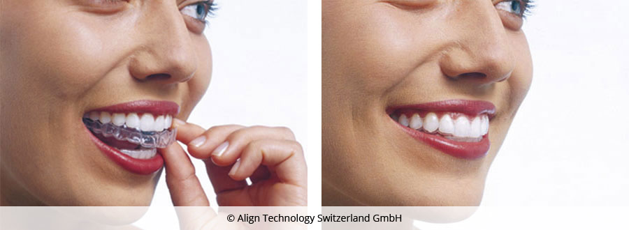 Hochelastische, durchsichtige Aligner (Zahnschienen) bewegen die Zähne unauffällig in die gewünschte Position und können in vielen Fällen als Alternative zur festen Zahnspange eingesetzt werden.