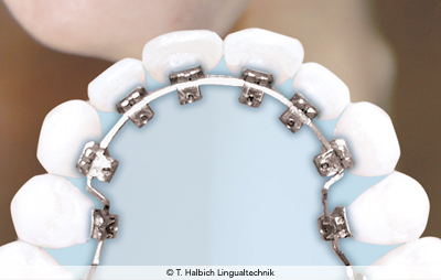 Unsichtbare feste Zahnspange, bei der die Brackets an der Zahninnenseite befestigt werden.